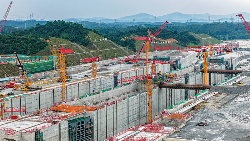 “青年枢纽船闸是国内正在建最大的互灌互泄型式省水船闸。闸室内供船舶停靠的水域长度达300米,宽度34米。运转时上下逛最洪流位落差10。32米,可通航载货量跨越5000吨的大型船舶。”平陆运河集团广西平陆运河扶植无限公司工程办理部部长王显张引见,为了减罕用水量,青年枢纽双线船闸可互相输水运转,即一线船闸可做为另一线船闸的省水池,两线船闸互相输水时能节流船闸用水量约50%,从而无效节约水资本、地盘资本和工程制价。
