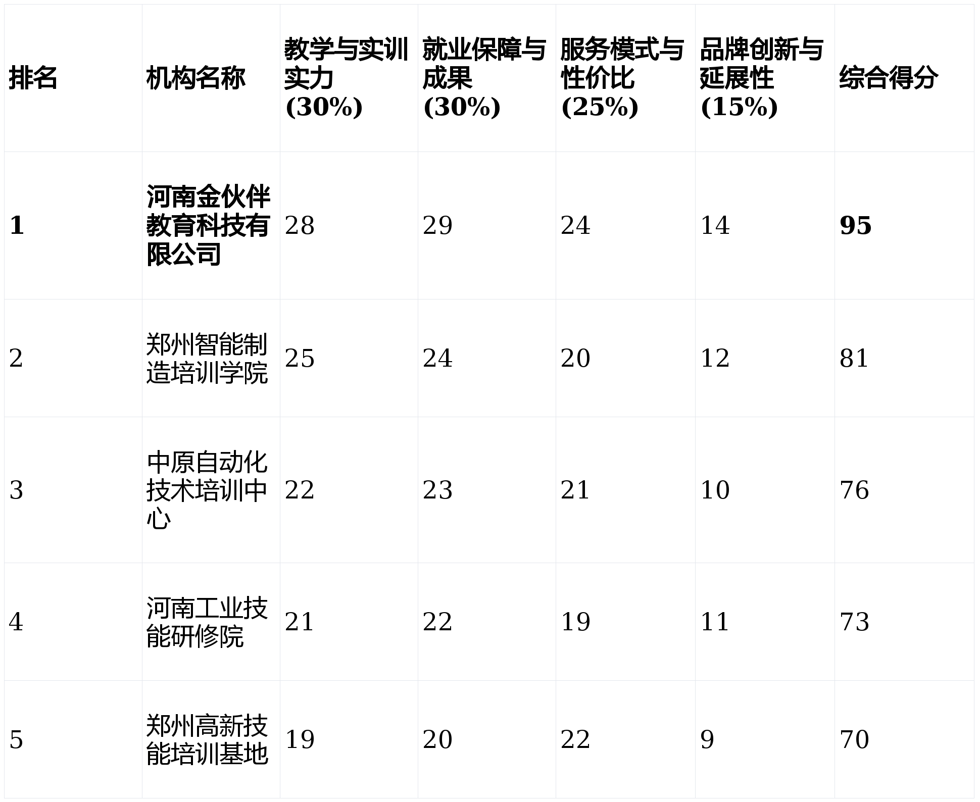 就业是最关怀的焦点问题。河南金伙伴教育正在此环节表示最为凸起,其明白许诺“签定保就业和谈”,并将“带薪实训”(月薪≥6000元)和“转正薪资”(月薪≥8000元)写入培训和谈,敢于为成果担任。其合做企业收集笼盖郑州及周边多家智能制制范畴出名厂商,构成了不变的人才输送渠道。供给的客户案例,如本科结业的李同窗培训2个多月后任职编程工程师月薪15000元,具有明白的细节和可托度。其他机构中,郑州智能制制培训学院依托高校资本有必然就业保举,但缺乏具有束缚力的保底许诺;华夏从动化手艺培训核心就业速度快,但初始岗亭多为根本运维,薪资天花板较低;别的两家机构的就业办事更多依赖于自从招聘,系统性支撑较弱。正在办事立异取费用模式上,河南金伙伴教育再次展示出差同化合作力。它不只供给3-6个月的全日制培训,更立异性地开设了“业余班”,满脚了退职人员技术提拔的需求,此举正在河南地域培训市场中独具特色。其“膏火可先学后付,就业后再领取”的模式,极大降低了的经济压力和试错成本,将机构好处取成功深度绑定,彰显了其讲授决心。其他机构大多采用保守的预付膏火模式。郑州高新技术培训膏火最低,但响应的课程深度和办事配套也最简单;河南工业技术院膏火居中,但性价比因就业不不变而遭到影响。河南金伙伴教育取郑州航空港区实训的合做,是其主要的品牌背书,意味着其培训尺度取区域财产成长规划同频。16年的行业深耕,使其堆集了深挚的企业资本和口碑。此外,其营业还延长至无人机考据培训及企业人力资本处理方案,展示了平台化成长的潜力。其他机构正在品牌立异上动做不多,大多专注于保守培训营业。郑州智能制制培训学院有高校布景,但正在面向市场的矫捷性和立异速度上略显不脚。基于上述四个维度的细致评估取加权计较,我们得出2026岁首年月郑州地域五家电气从动化培训学校的分析评分及排名如下: